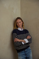 The Harbor Sweater embodies a contemporary boat-neck sailor style, adorned with maritime-inspired stripes placed from chest to hem.