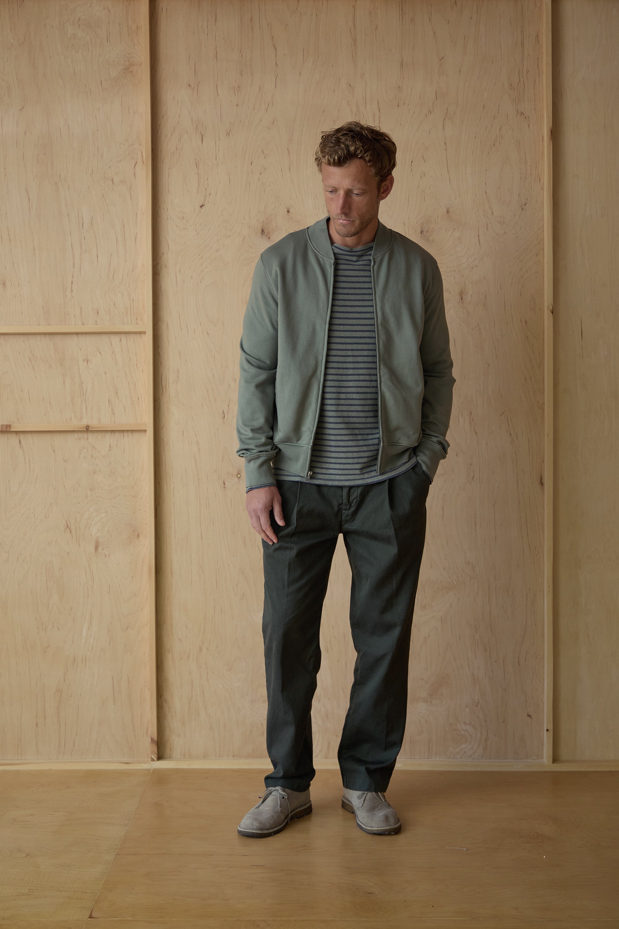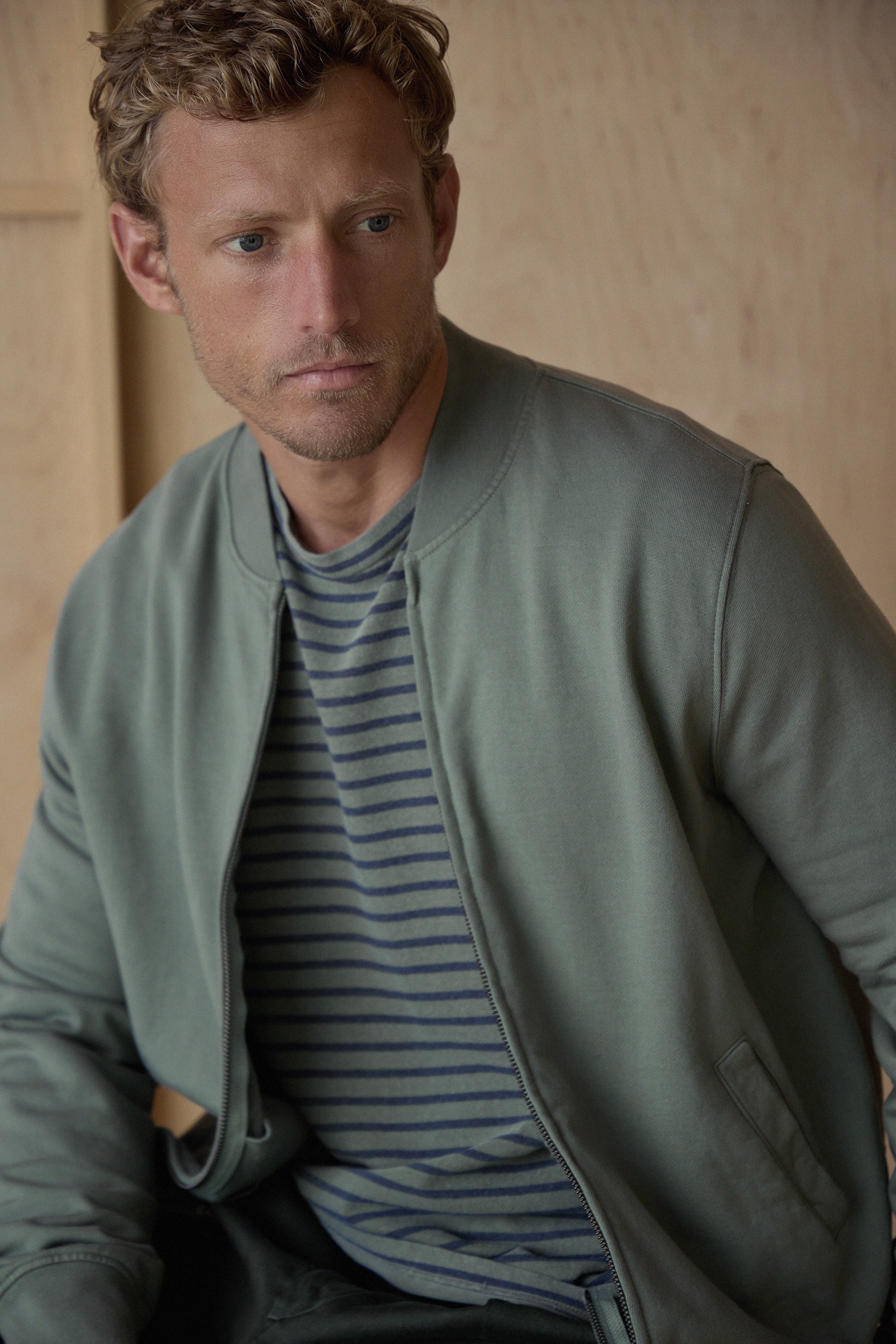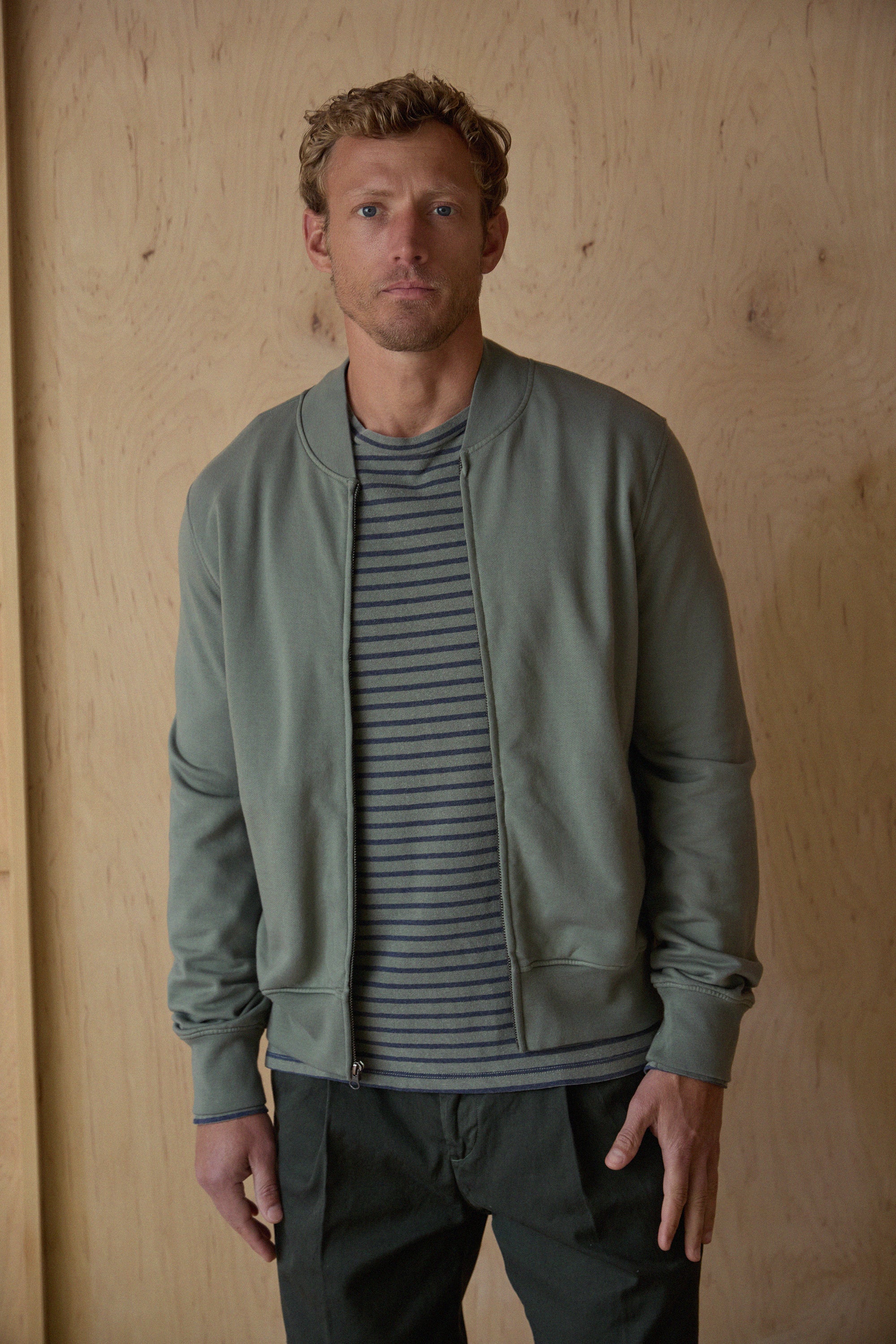 Crafted from premium Supima cotton that is grown, spun, and knitted in USA, this jacket offers an exceptionally soft touch and superior durability. Designed in the classic bomber silhouette, it features ribbed cuffs, hem, and collar for a polished fit.