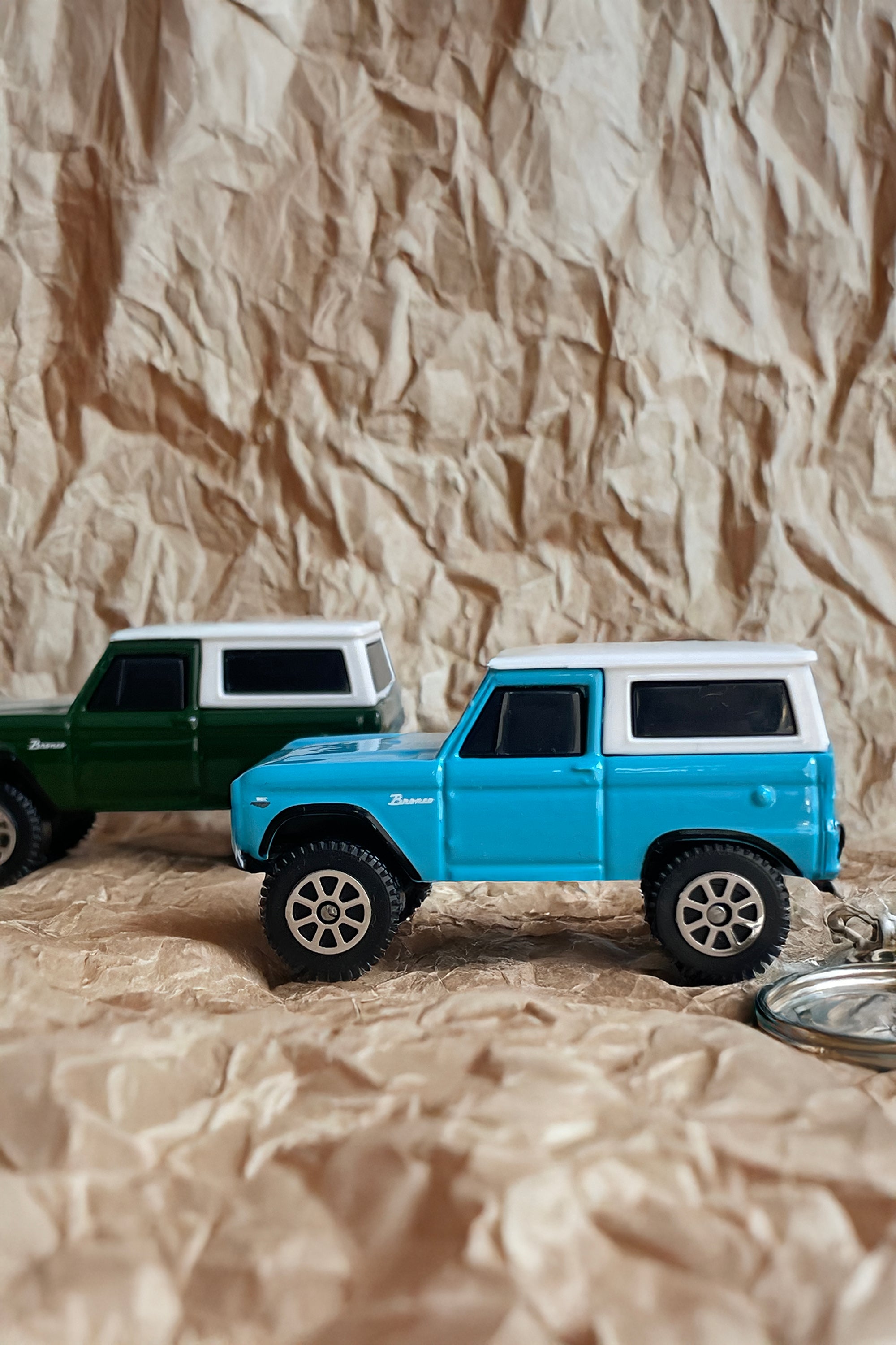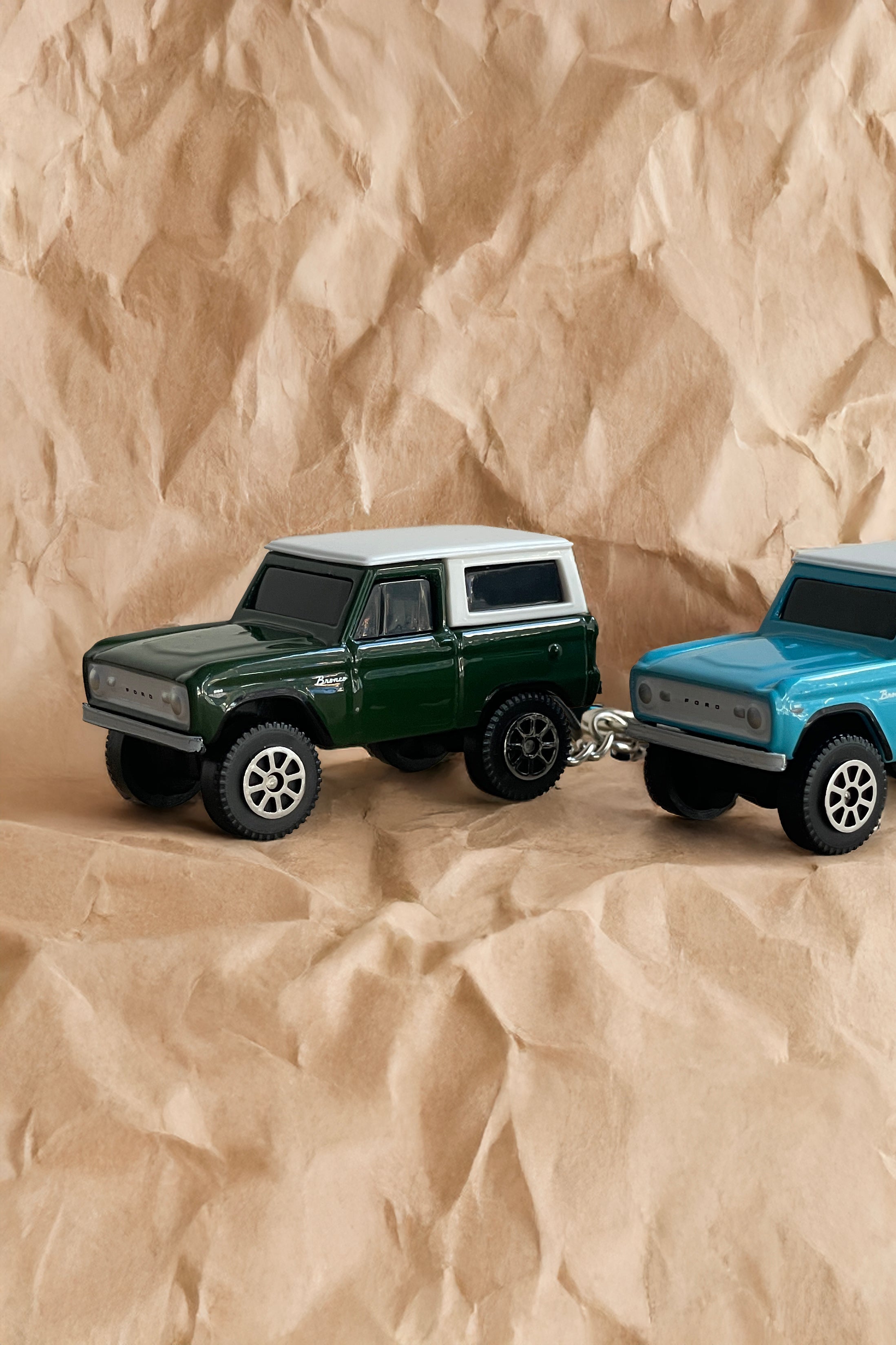 This die-cast keychain offers a daily nod to nostalgia—a miniature replica of the iconic 1966 Ford Bronco, perfectly sized for your keyring or fob. Available in Caribbean Turquoise or Oak Green, it measures 2.25" x 1.125" and is proudly made in Iowa.