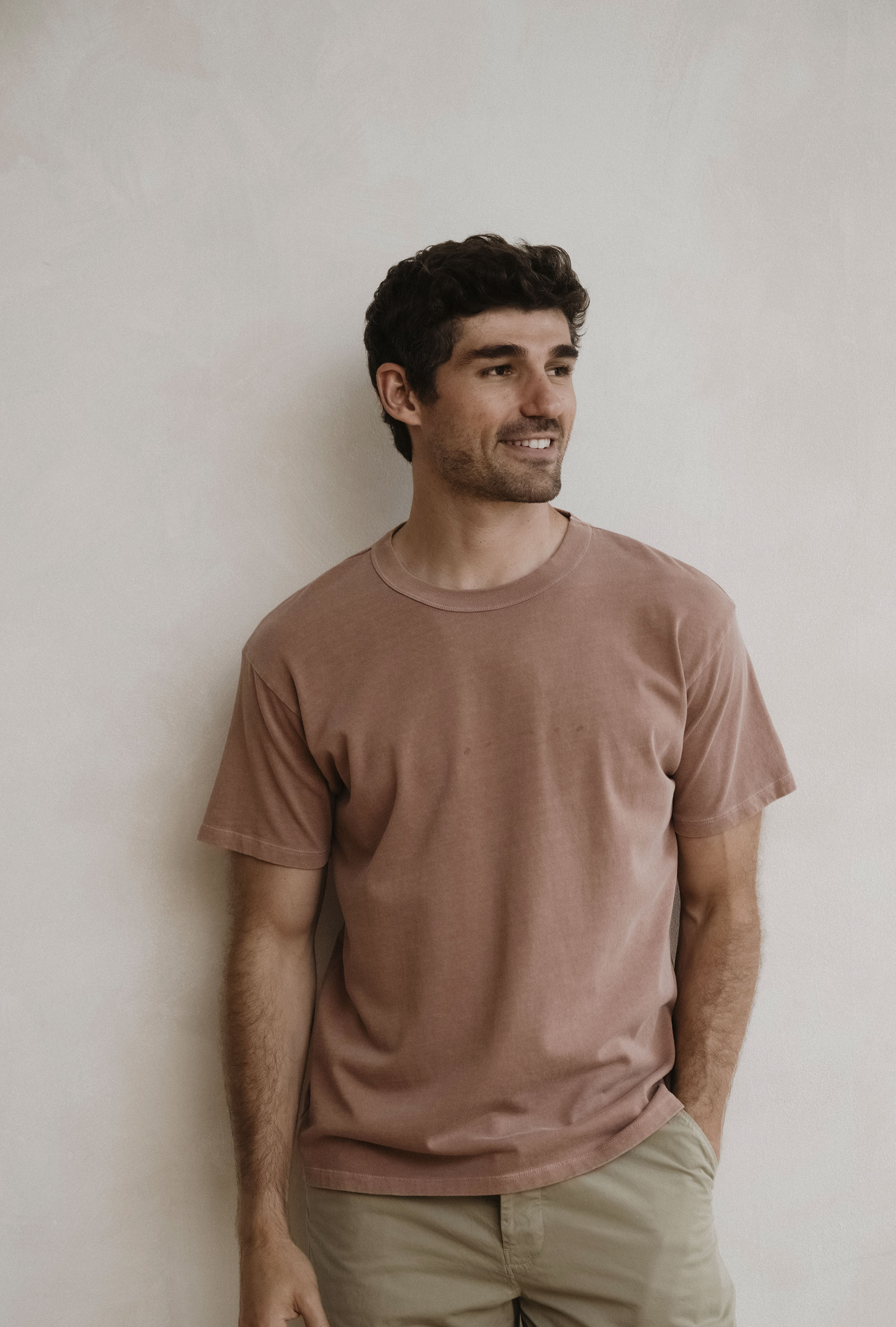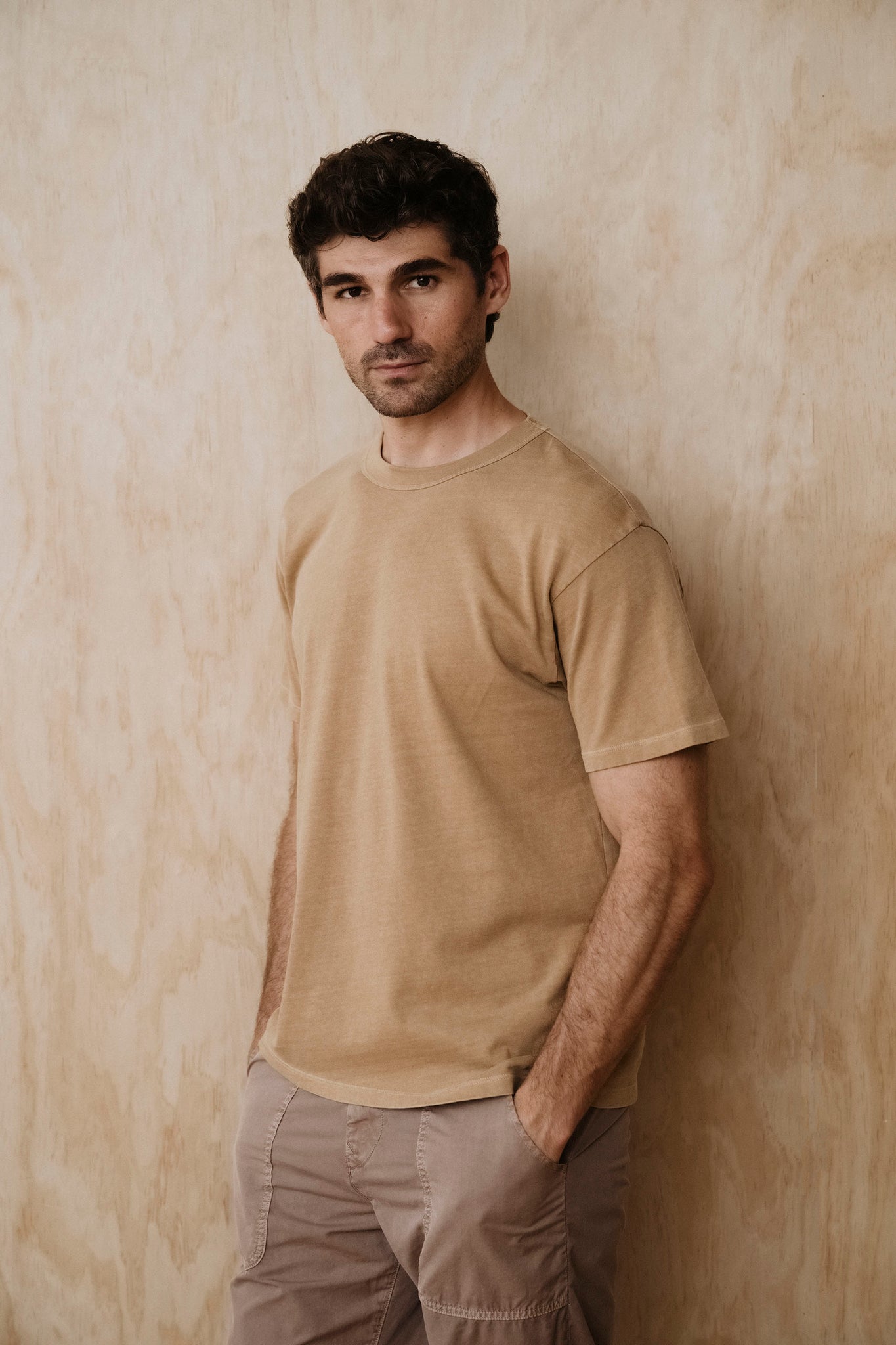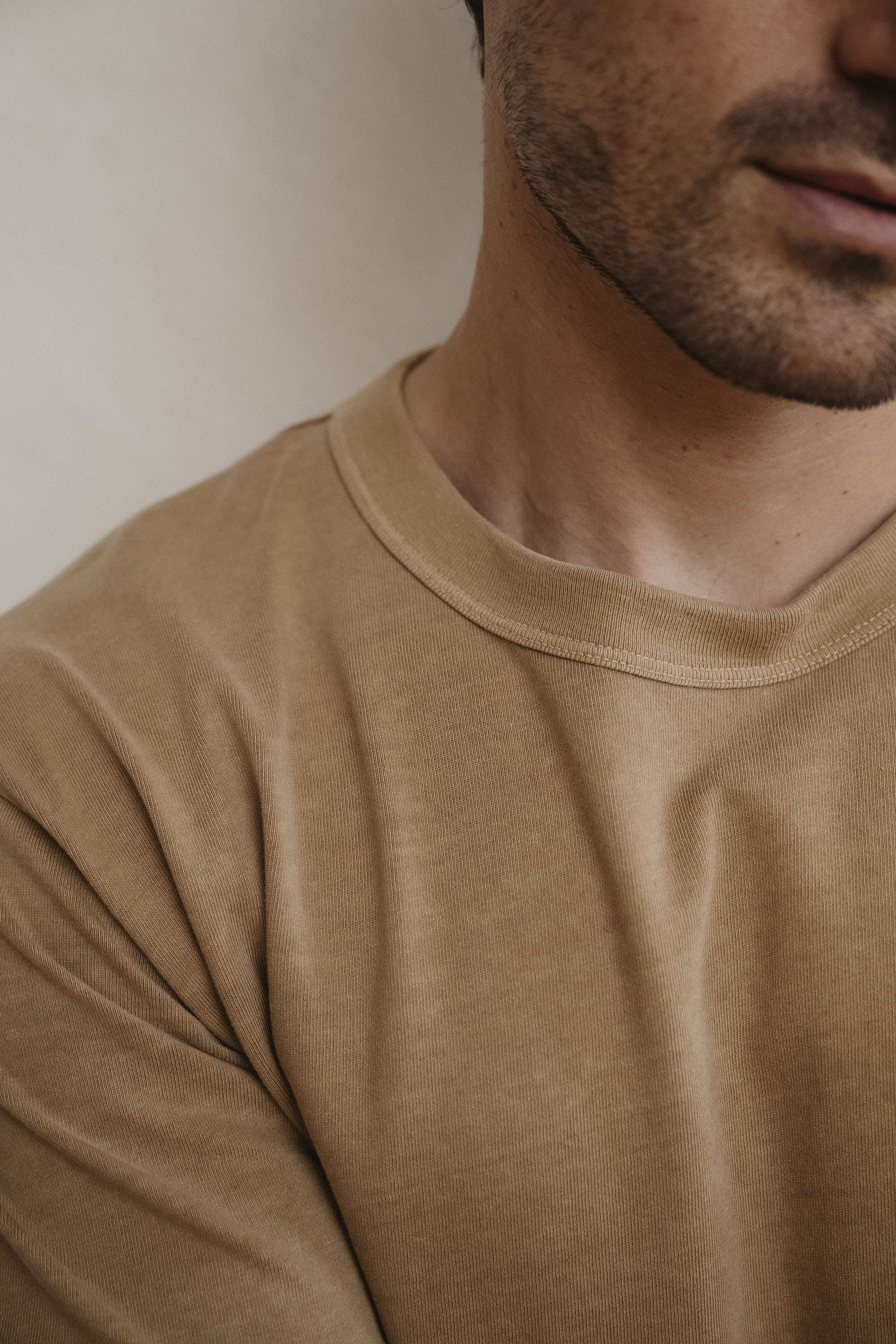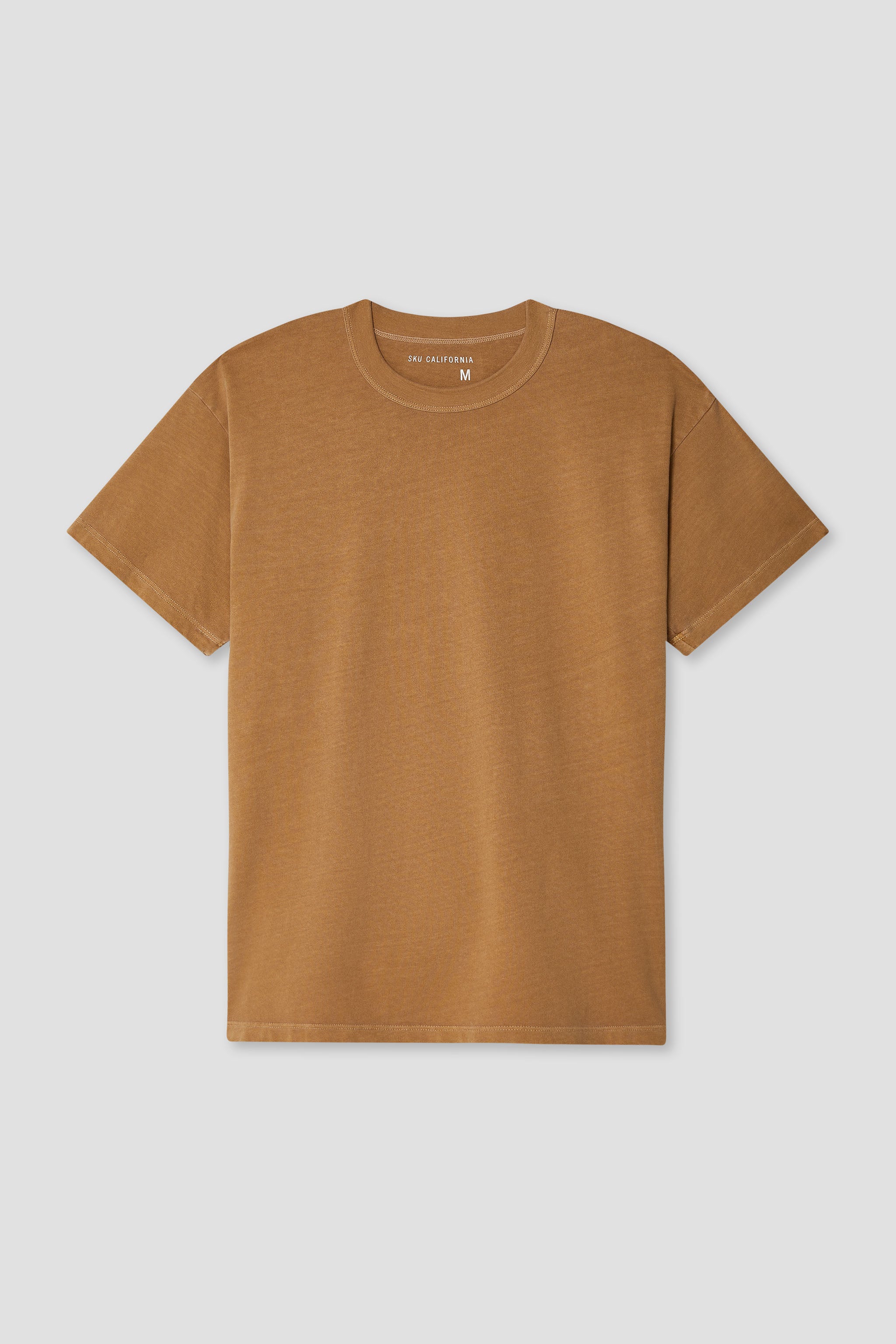 With the combination of the heavier weight recycled cotton quality and pigment dye process, this tee has an uneven high low that is more textural than our other tees.