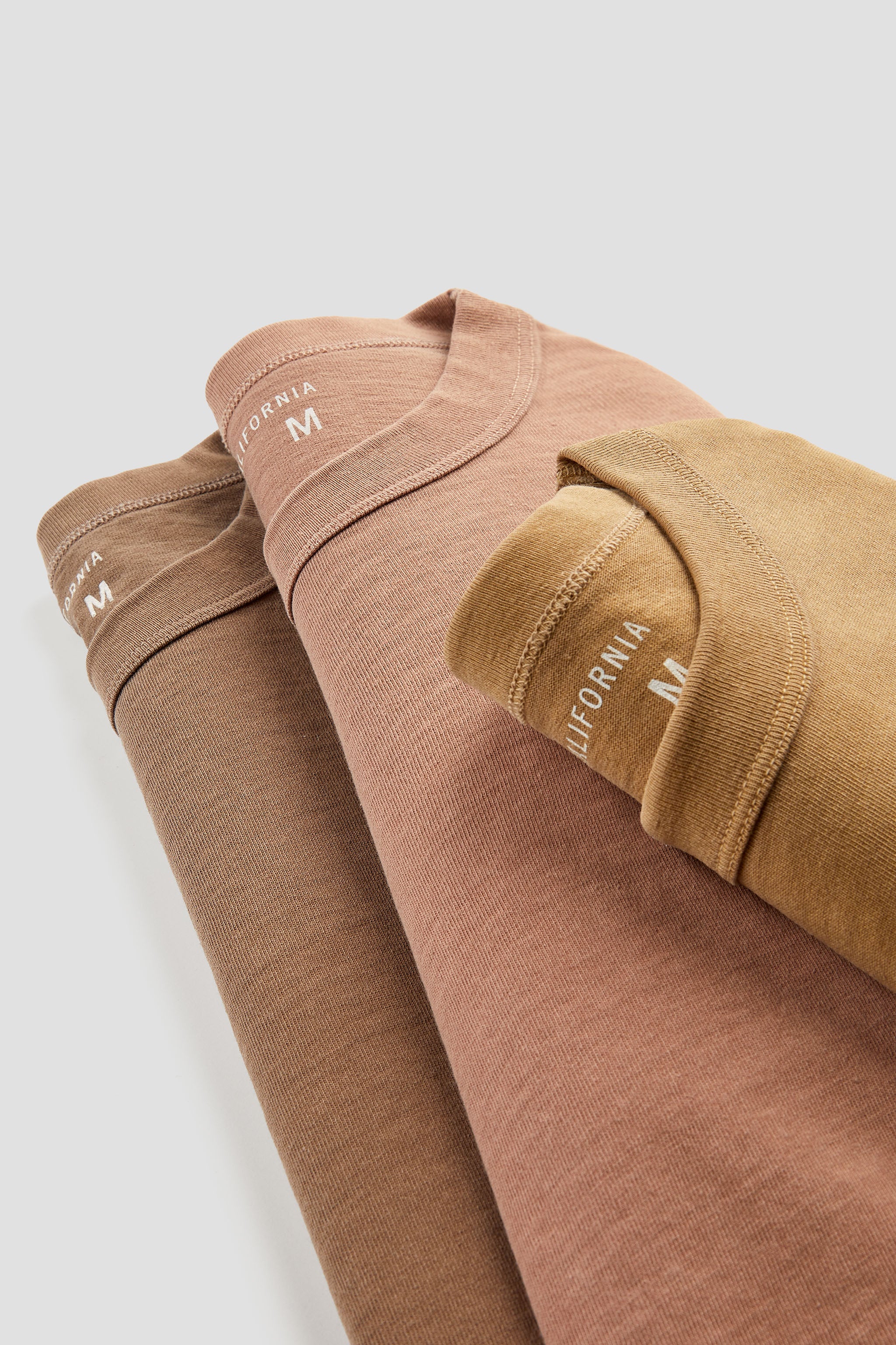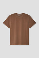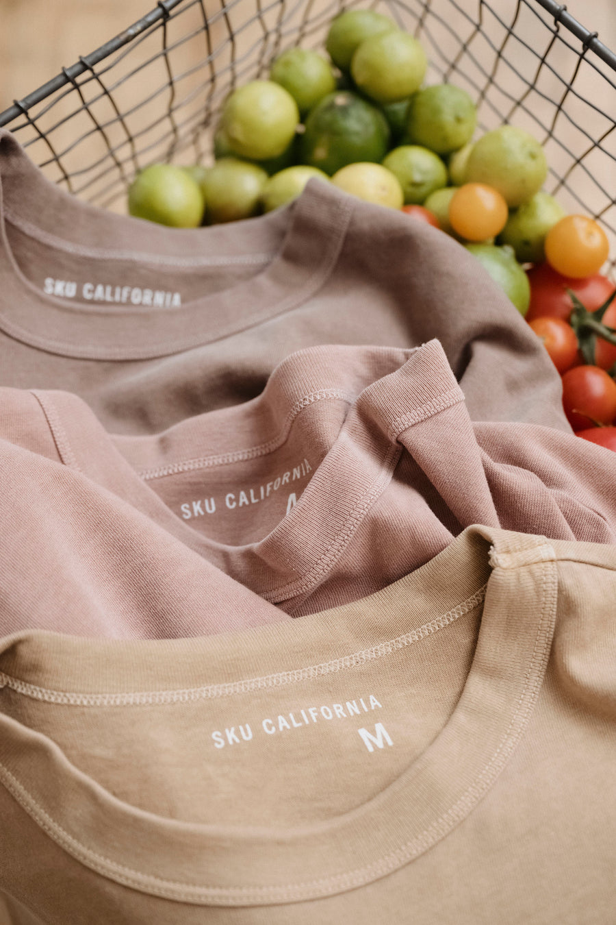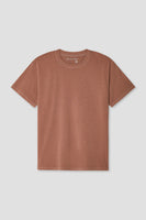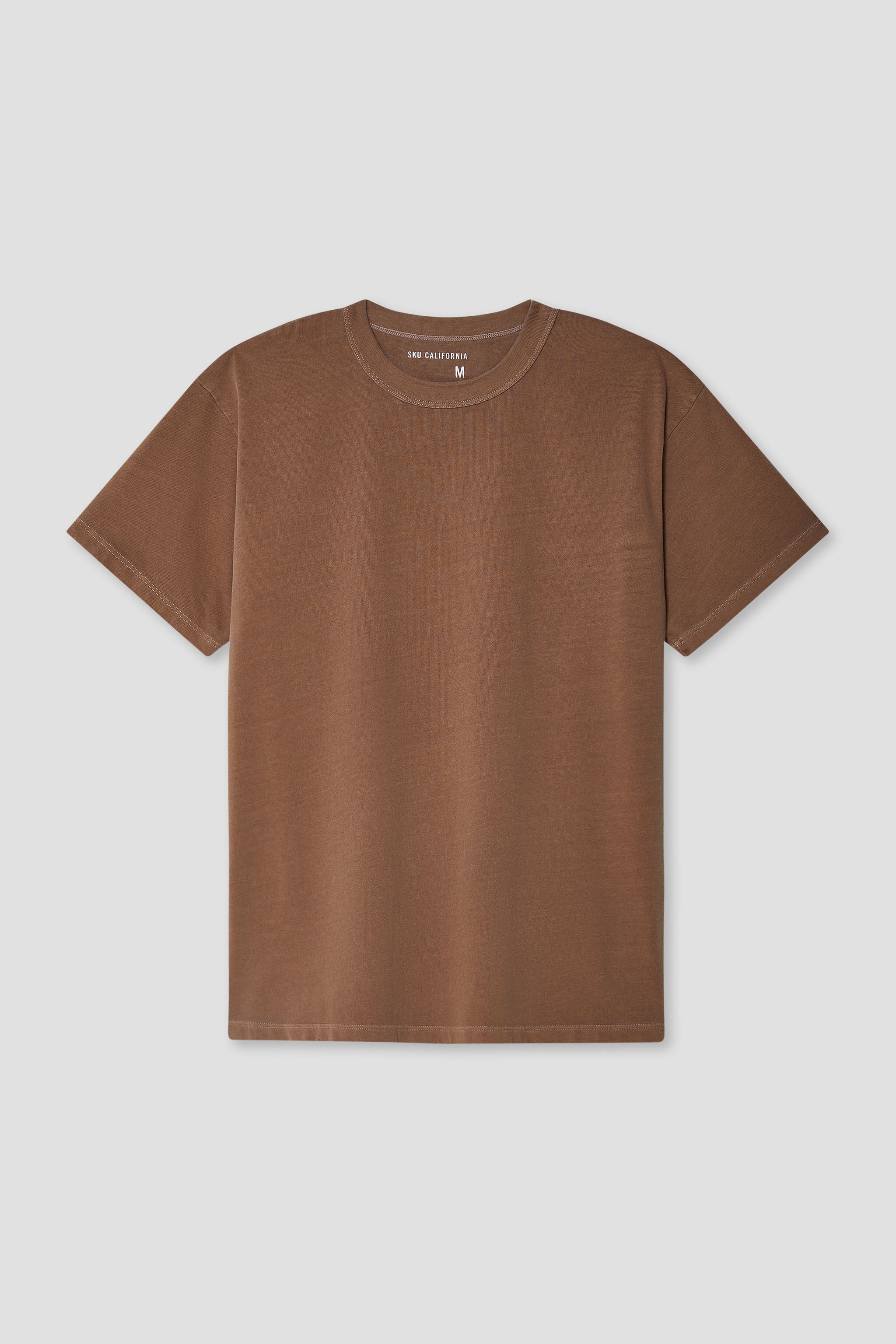 With the combination of the heavier weight recycled cotton quality and pigment dye process, this tee has an uneven high low that is more textural than our other tees.