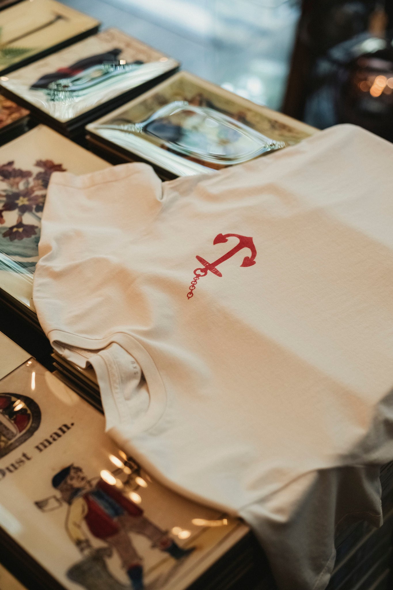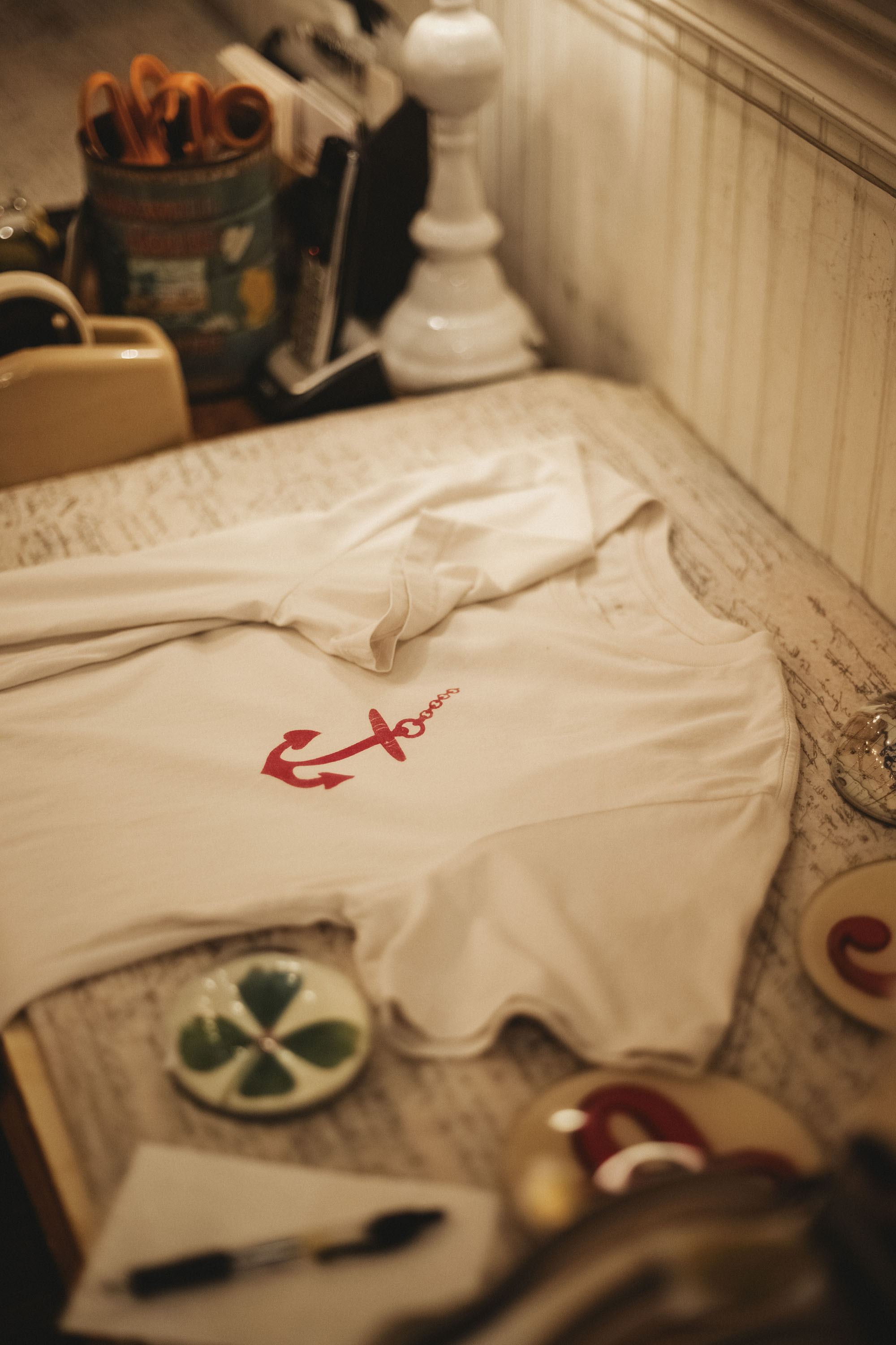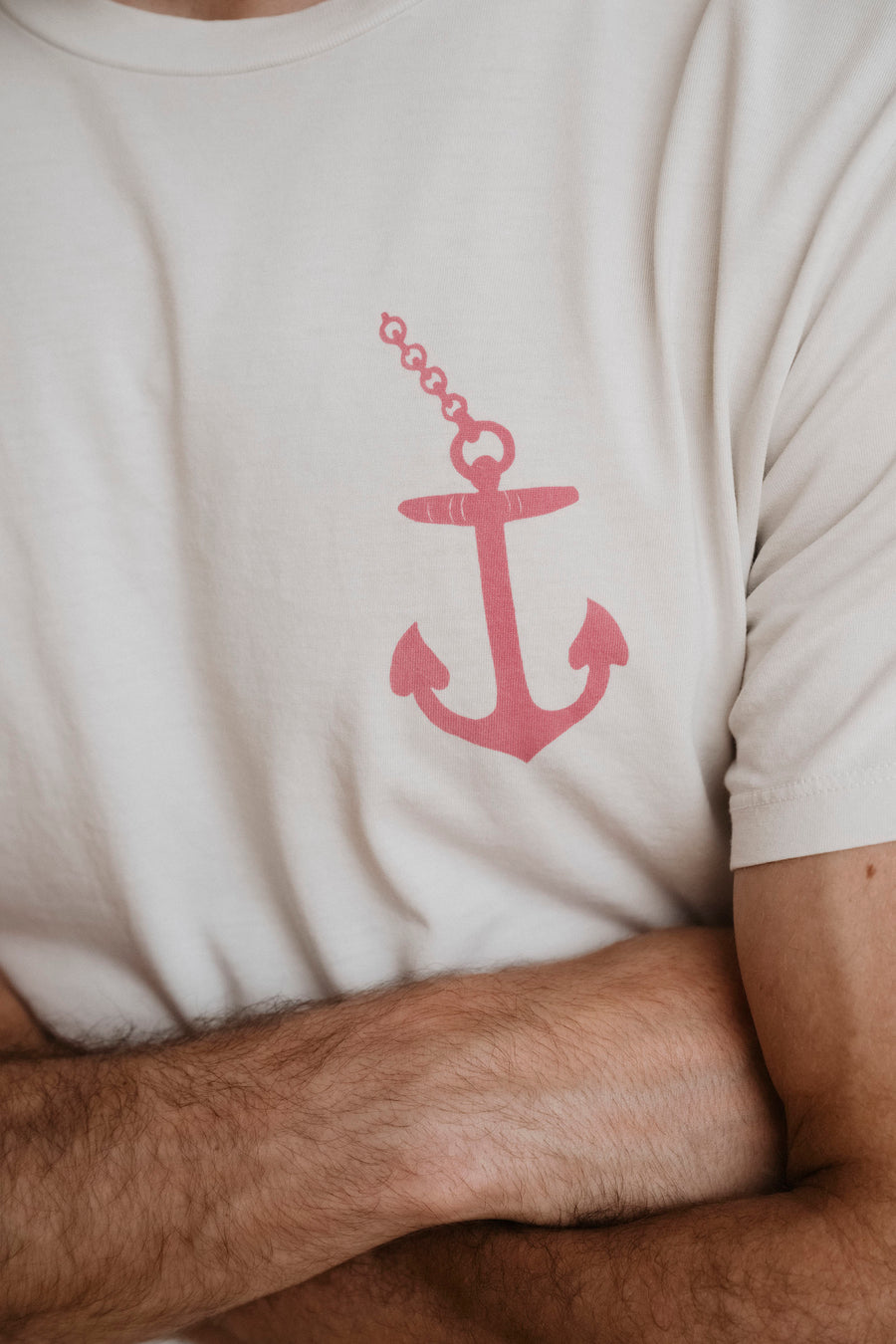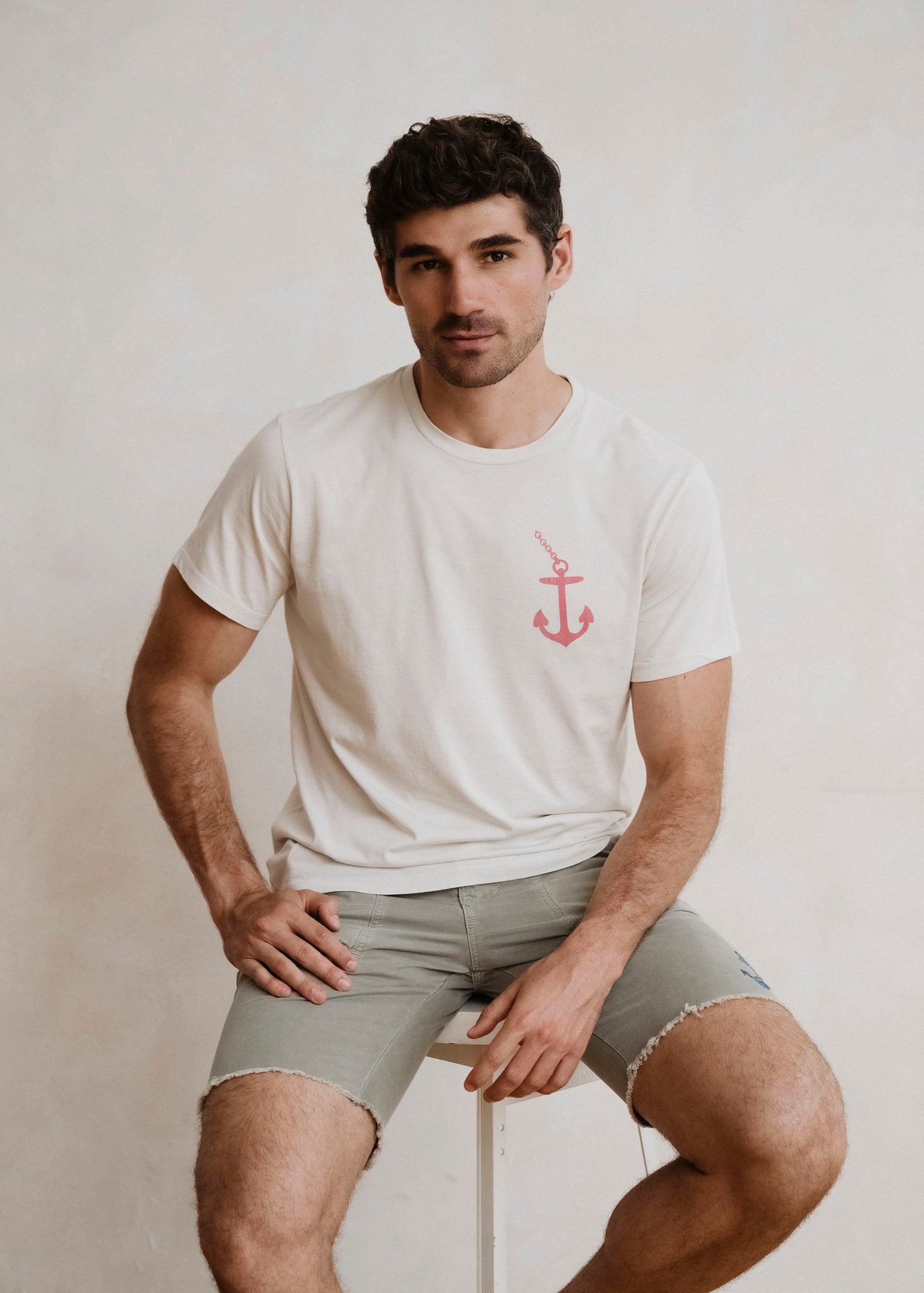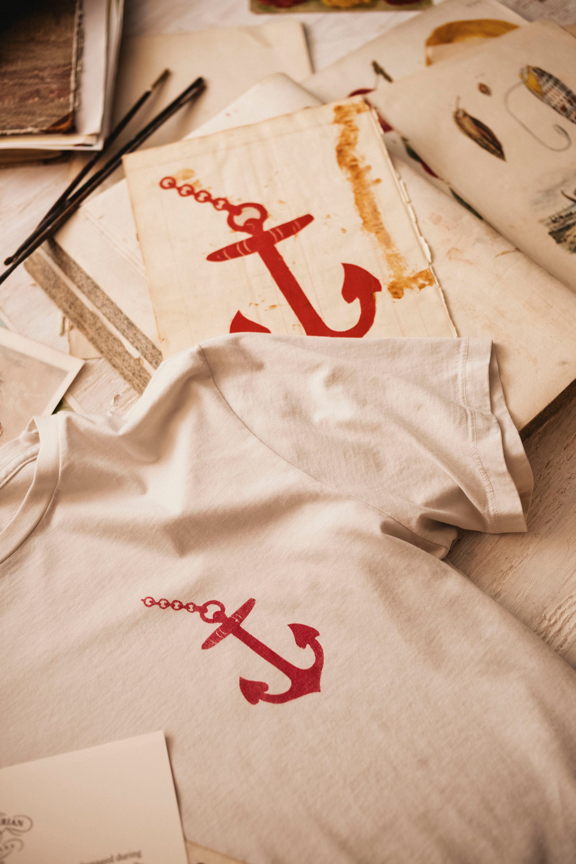 This collaborative tee features a red anchor graphic from John's decoupage archive, a nod to an icon on this soft Supima tee that is grown, spun, knit, sewn, and printed in the USA.