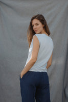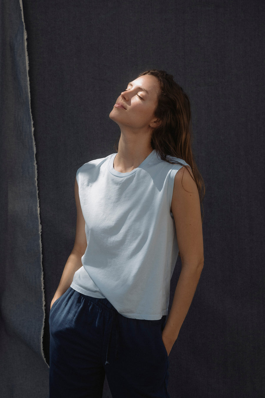 La camiseta sin mangas tiene un corte corto que se ajusta cómodamente a la cintura y es ideal para combinar con pantalones de tiro medio o alto. Está confeccionada con el mejor algodón de Estados Unidos y teñida en prenda para lograr una sensación suave y desgastada. Cuello redondo básico.