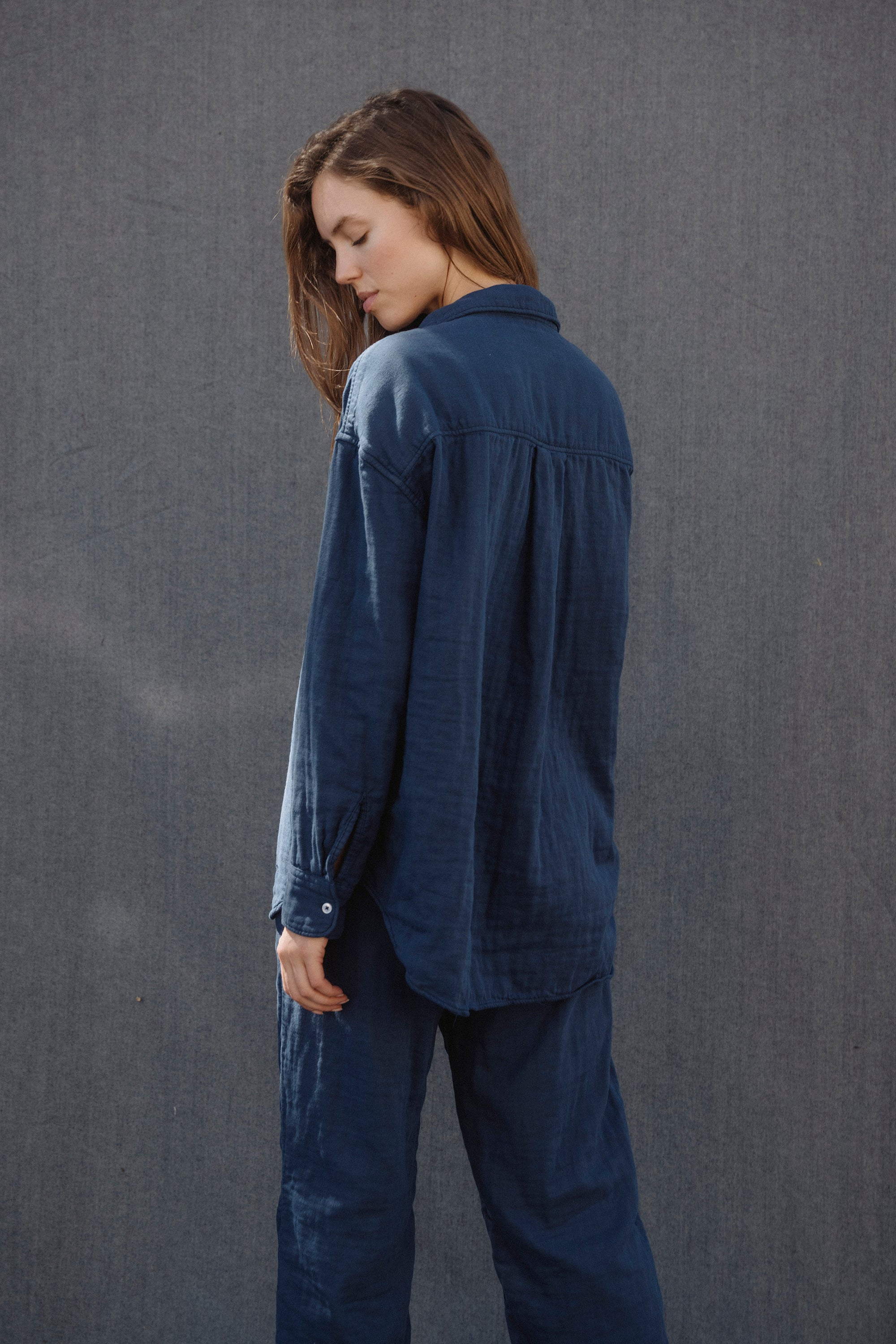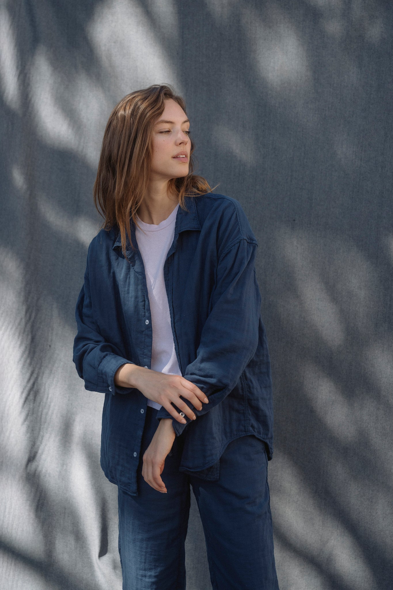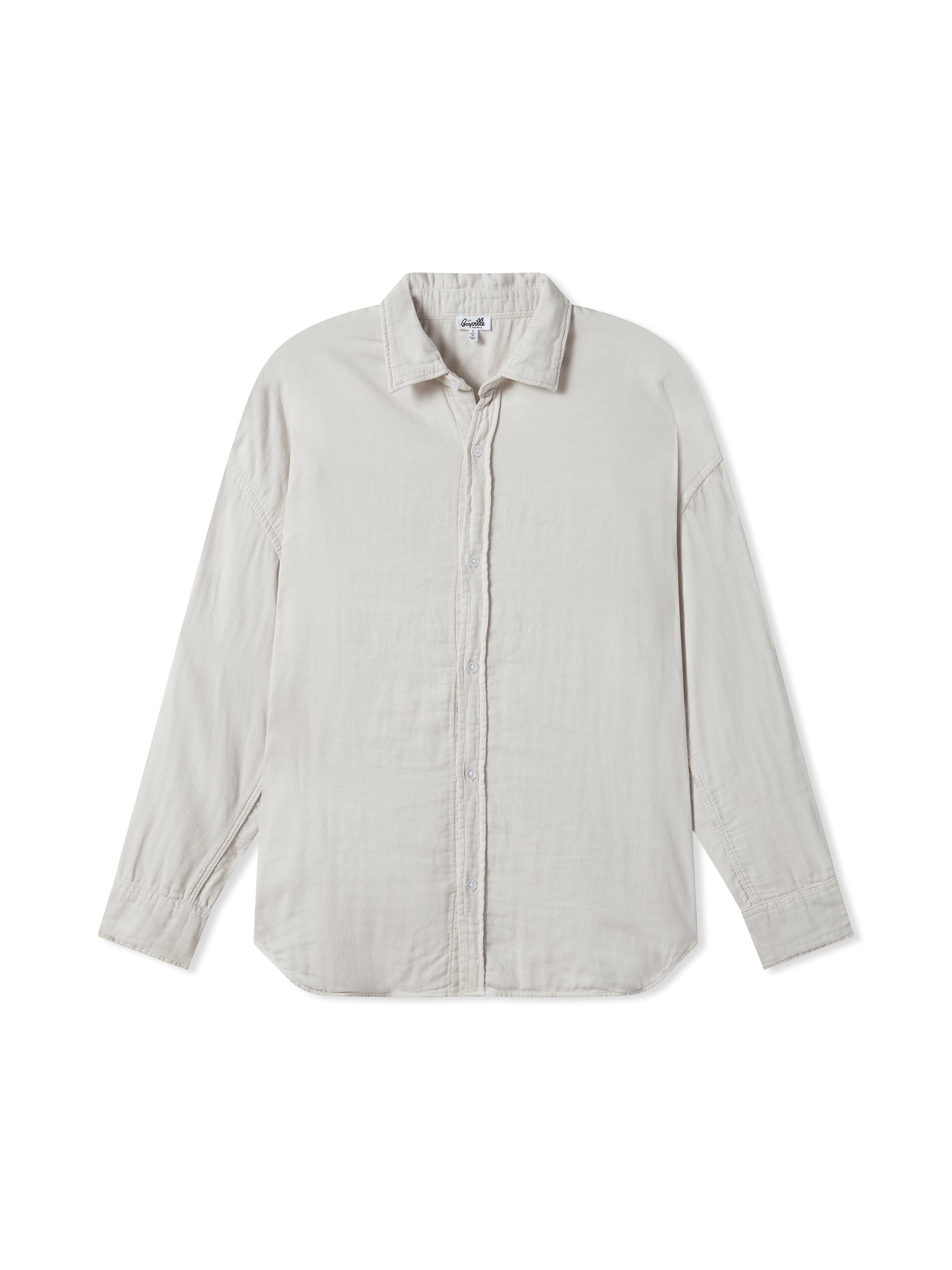 Our best-selling lounge shirt is now reimagined with a fit designed just for our Boyville crew. This oversized, slouchy silhouette is crafted from breathable triple-layer cotton gauze, striking a great balance between relaxed comfort and refined style with its lightweight feel and structured collar.  It is a light and flowy fit that is great for this spring and summer.