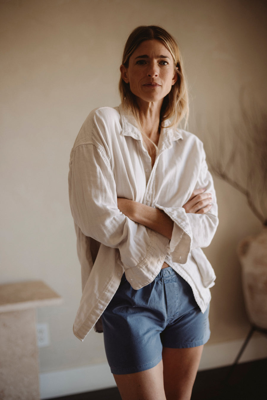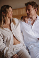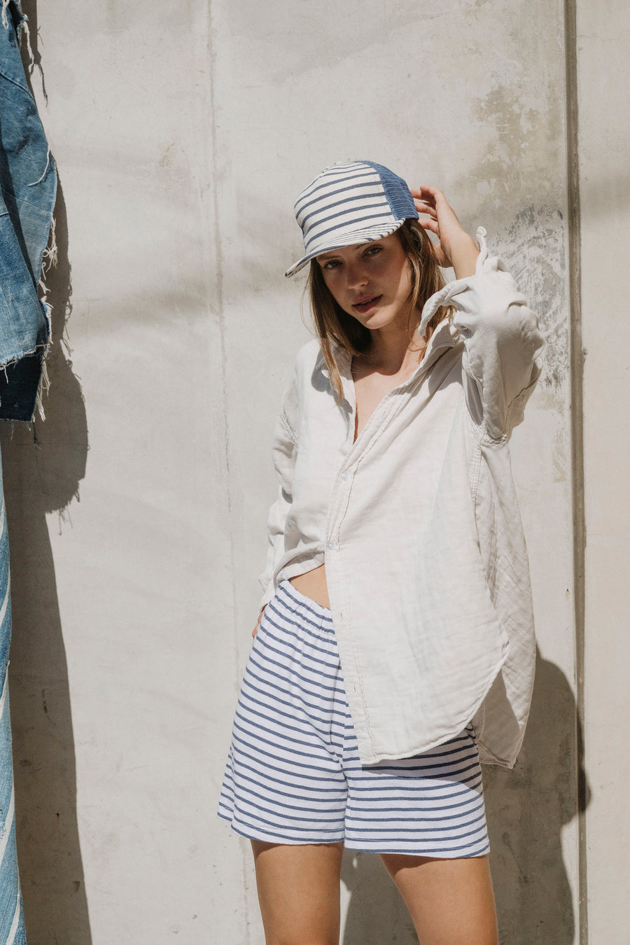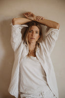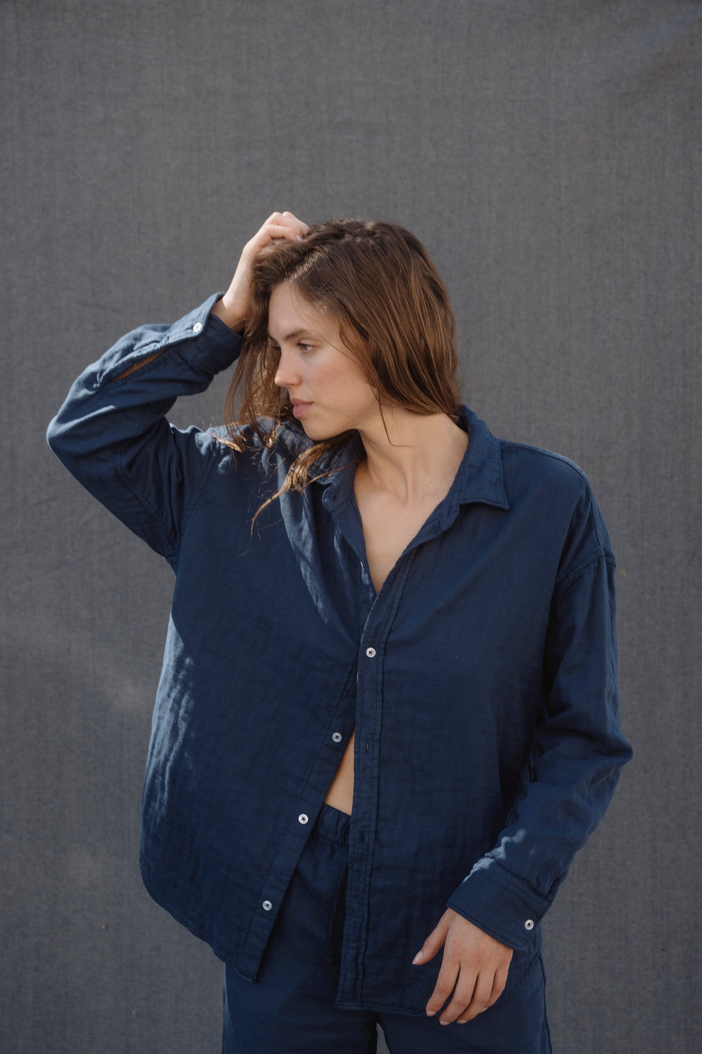 Our best-selling lounge shirt is now reimagined with a fit designed just for our Boyville crew. This oversized, slouchy silhouette is crafted from breathable triple-layer cotton gauze, striking a great balance between relaxed comfort and refined style with its lightweight feel and structured collar.  It is a light and flowy fit that is great for this spring and summer.
