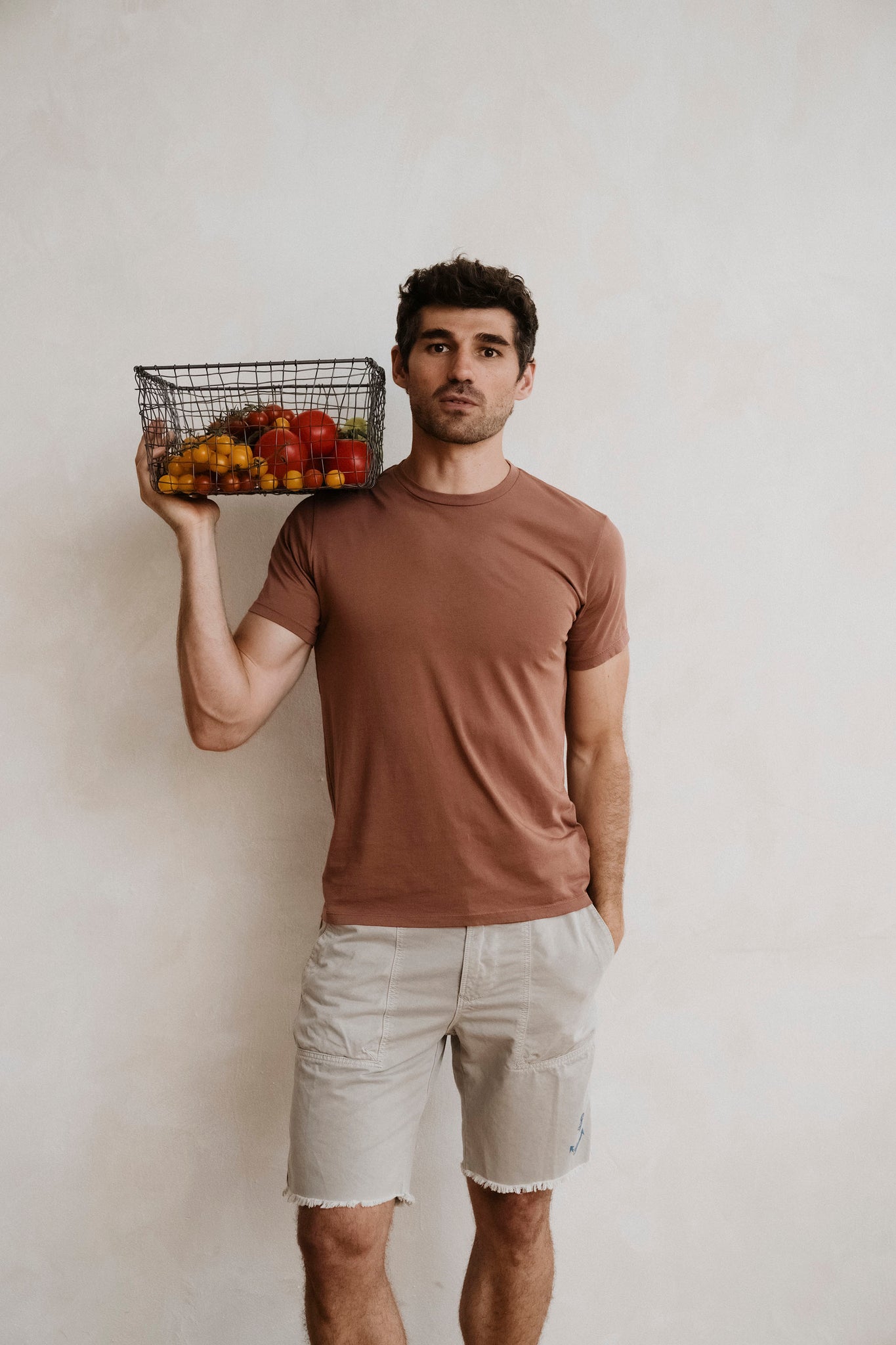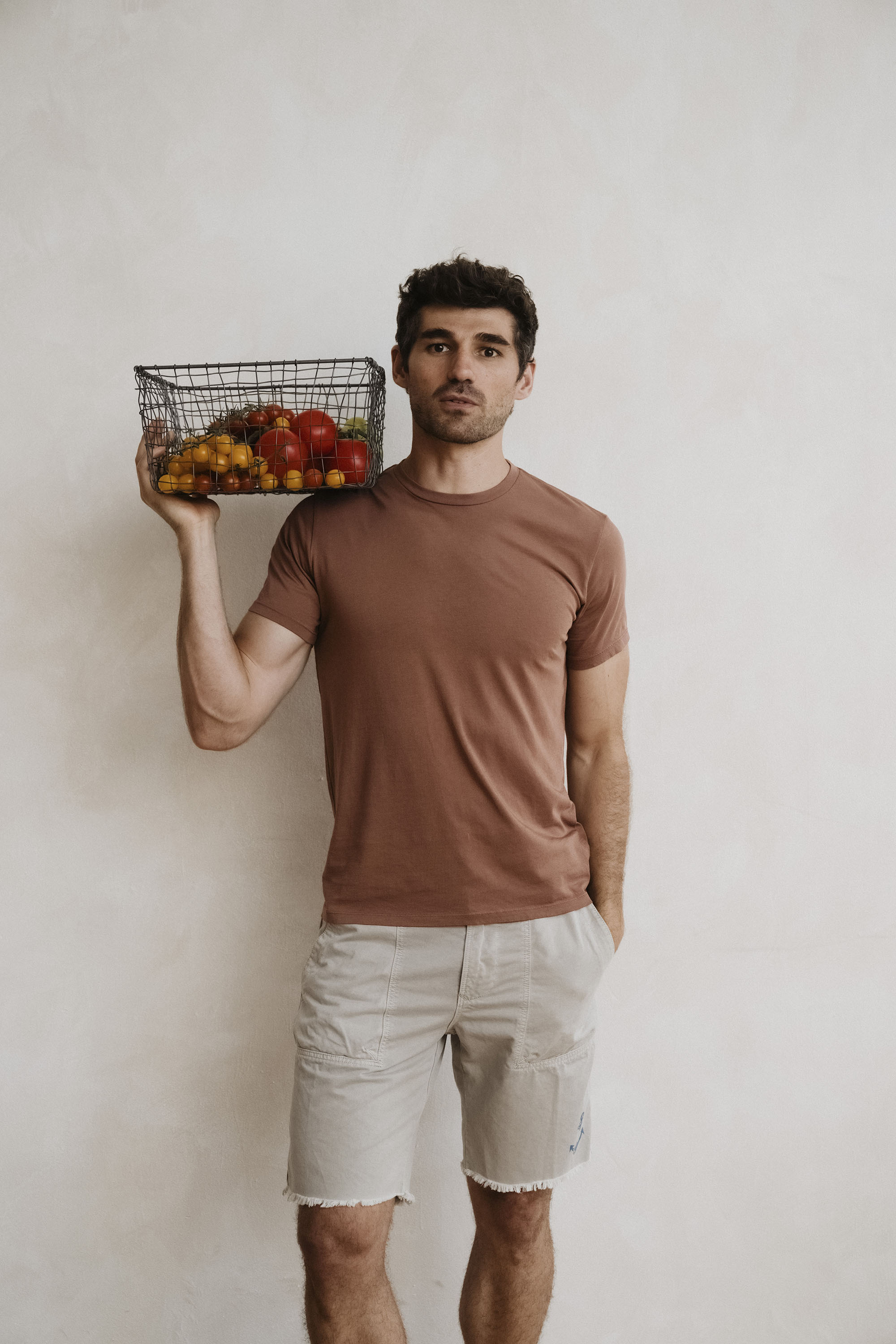 Anselmo is wearing 32W short and size L tee.