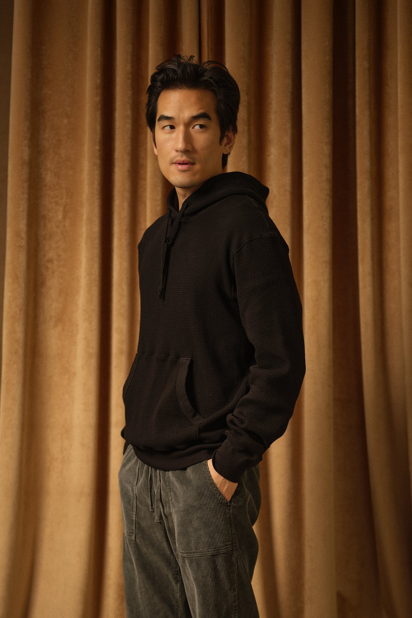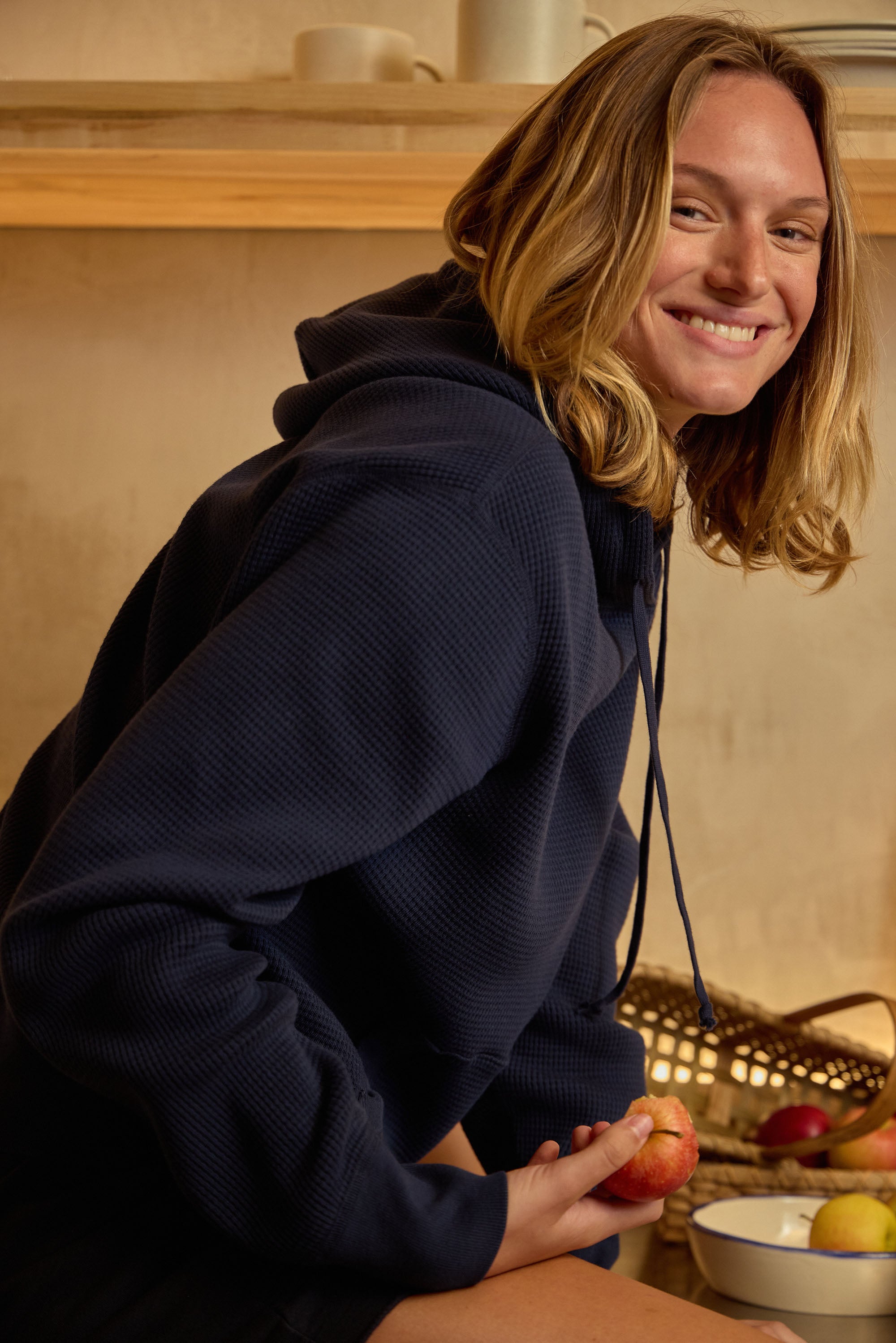 Made from a soft but substantial waffle-knit fabric, this hoodie offers a breathable yet cozy feel that’s ideal for layering or wearing on its own.