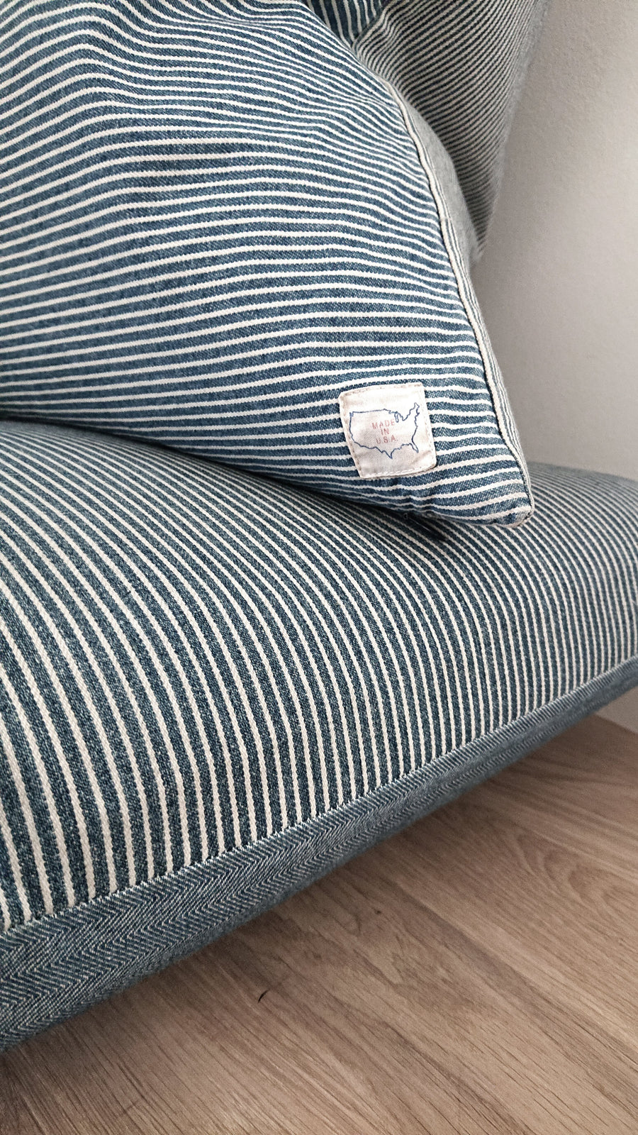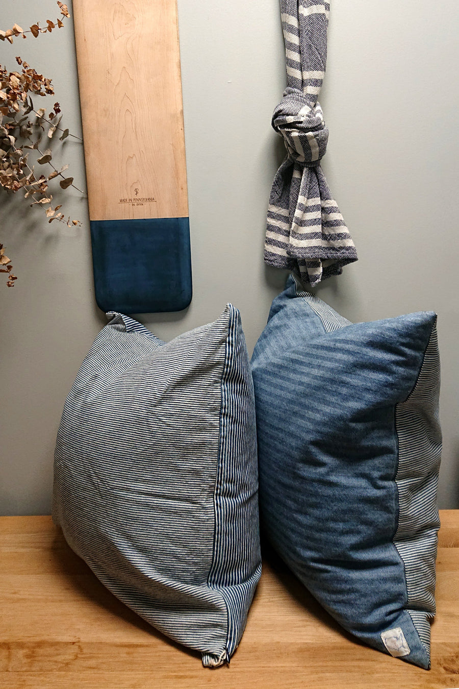 The indigo stripe pillows are made from chambray denim fabrics and washed for a vintage indigo look. One side has indigo stripe, the other side has indigo herringbone.