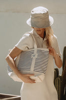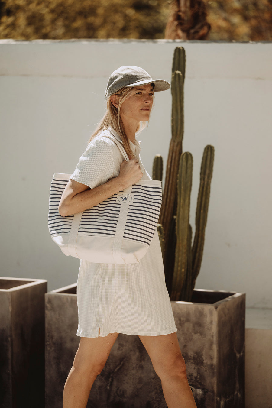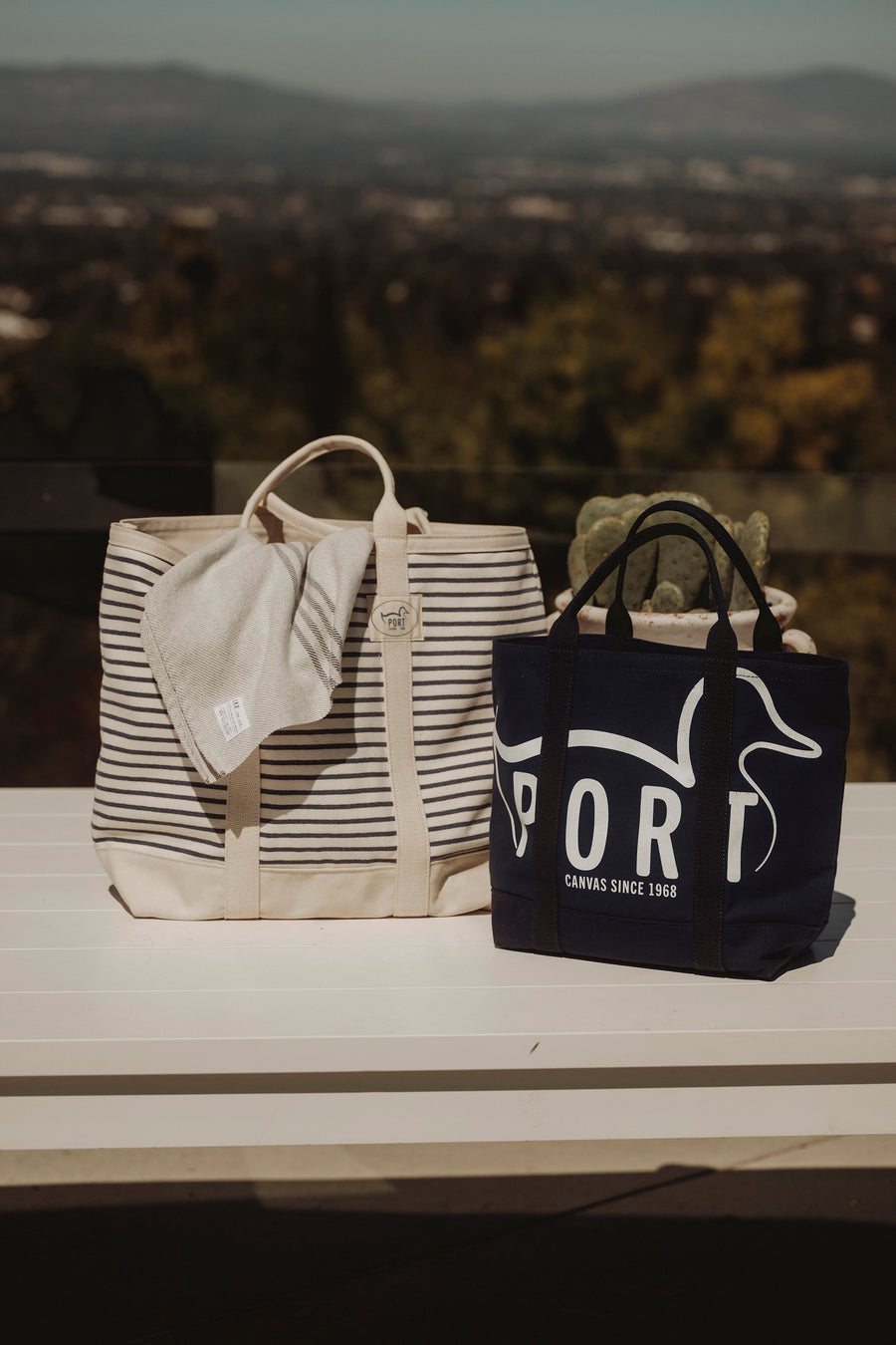 Our favorite everyday tote just got a new pattern. Enjoy this classic tote in a marine stripe pattern.