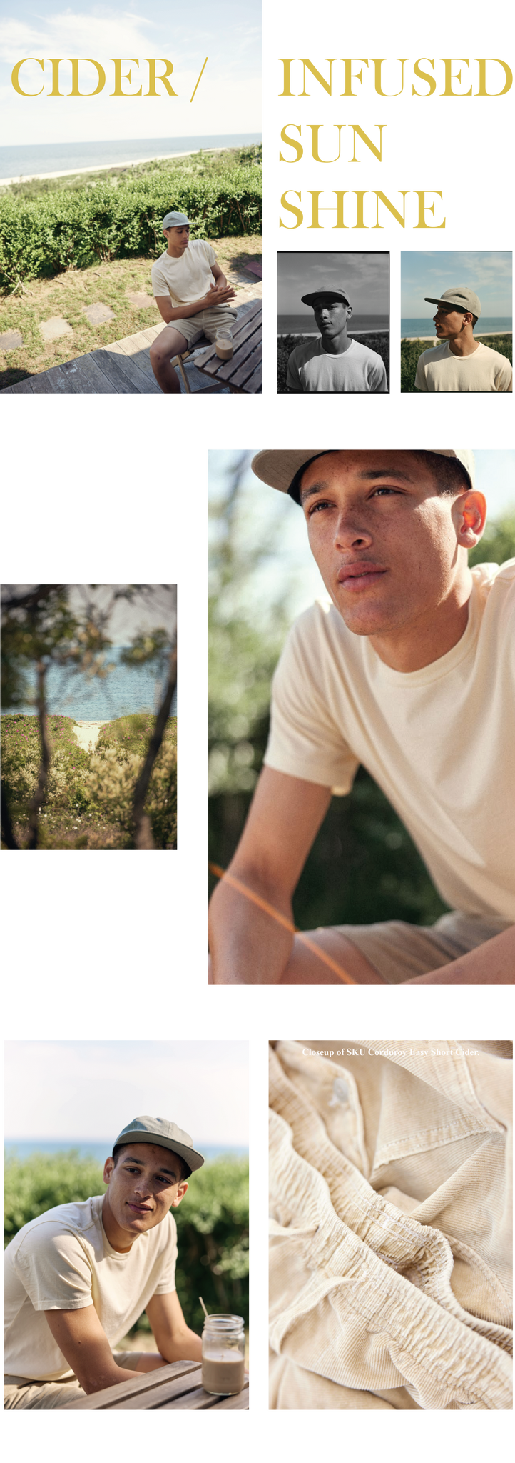 Cider is an easy color to pair with neutral colors like khaki, sand, and bleach white. This faded yellow also works well with pigment-dyed sage and olive.